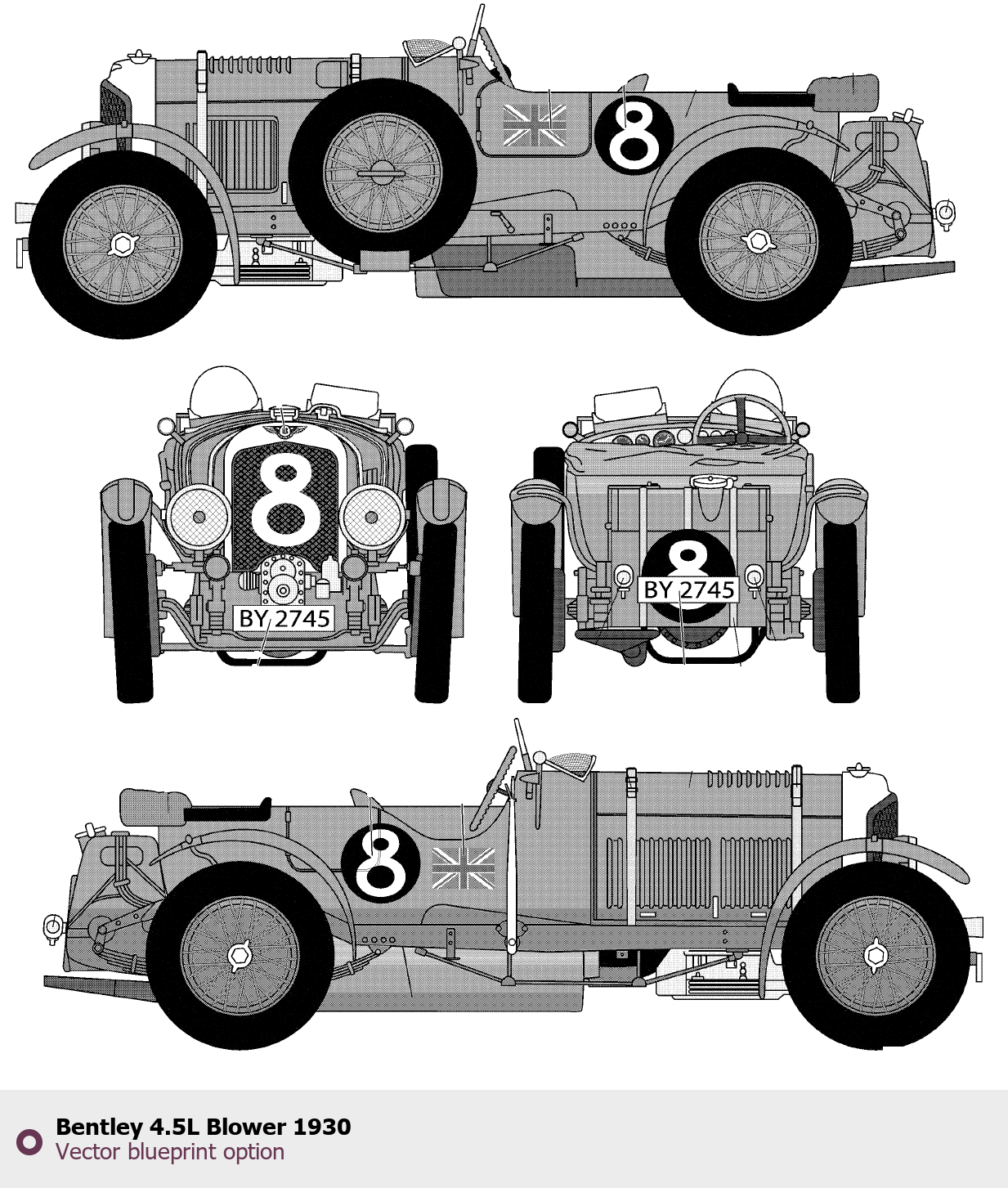 Raster blueprint of the 1930 Bentley 4.5L Blower Sedan. This free downloadable image can be used for graphic projects, digital design, and 3D modeling. The file provides accurate exterior proportions of the vehicle. Model year: 1930. Body type: Sedan.
