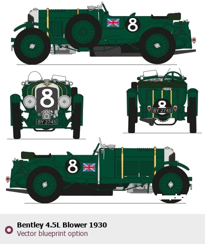 Raster blueprint of the 1930 Bentley 4.5L Blower Sedan. This free downloadable image can be used for graphic projects, digital design, and 3D modeling. The file provides accurate exterior proportions of the vehicle. Model year: 1930. Body type: Sedan.