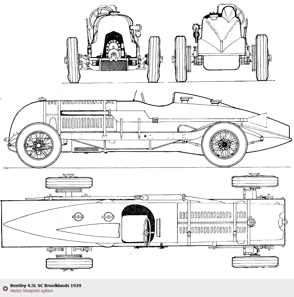 Raster blueprint of the 1929 Bentley 4.5L SC Broolklands Sedan. This free downloadable image can be used for graphic projects, digital design, and 3D modeling. The file provides accurate exterior proportions of the vehicle. Model year: 1929. Body type: Sedan.