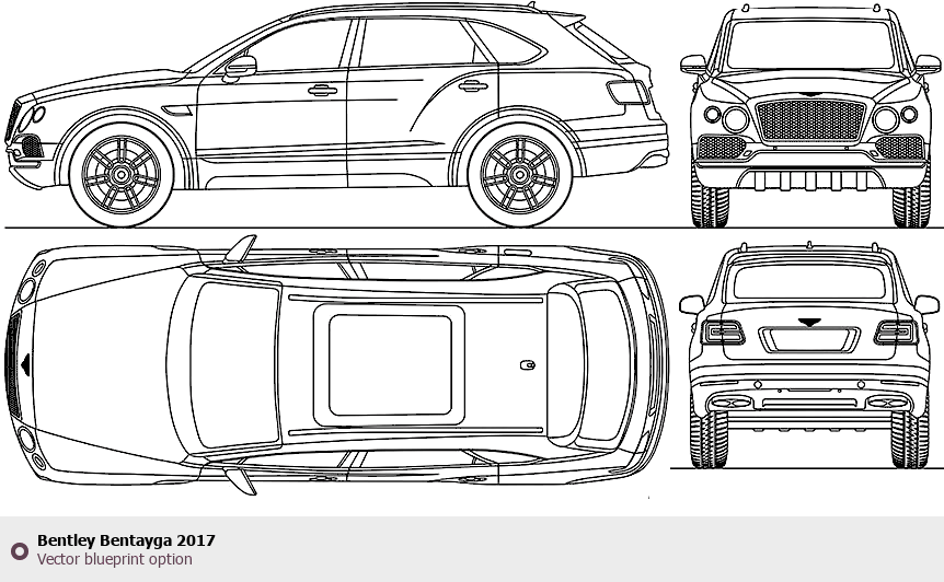 Raster blueprint of the 2017 Bentley Bentayga Tag. This free downloadable image can be used for graphic projects, digital design, and 3D modeling. The file provides accurate exterior proportions of the vehicle. Model year: 2017. Body type: Tag.