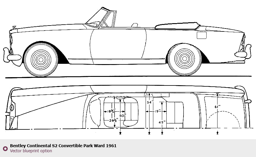 Raster blueprint of the 1961 Bentley Continental S2 Convertible Park Ward Cabriolet. This free downloadable image can be used for graphic projects, digital design, and 3D modeling. The file provides accurate exterior proportions of the vehicle. Model year: 1961. Body type: Cabriolet.
