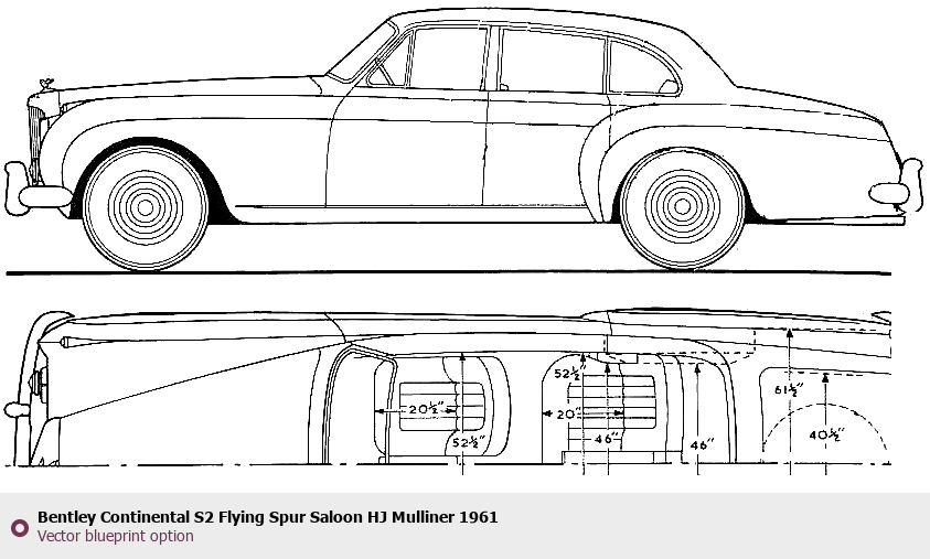 Raster blueprint of the 1961 Bentley Continental S2 Flying Spur Saloon HJ Mulliner Sedan. This free downloadable image can be used for graphic projects, digital design, and 3D modeling. The file provides accurate exterior proportions of the vehicle. Model year: 1961. Body type: Sedan.