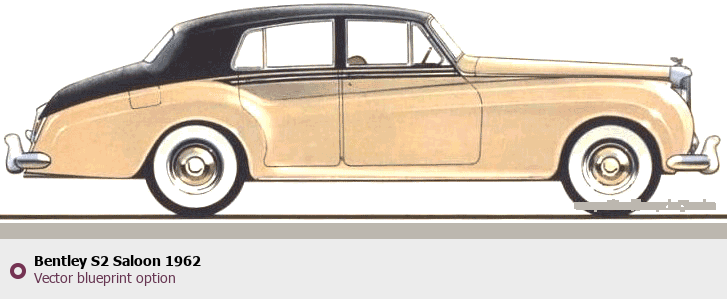 Raster blueprint of the 1962 Bentley S2 Saloon Sedan. This free downloadable image can be used for graphic projects, digital design, and 3D modeling. The file provides accurate exterior proportions of the vehicle. Model year: 1962. Body type: Sedan.