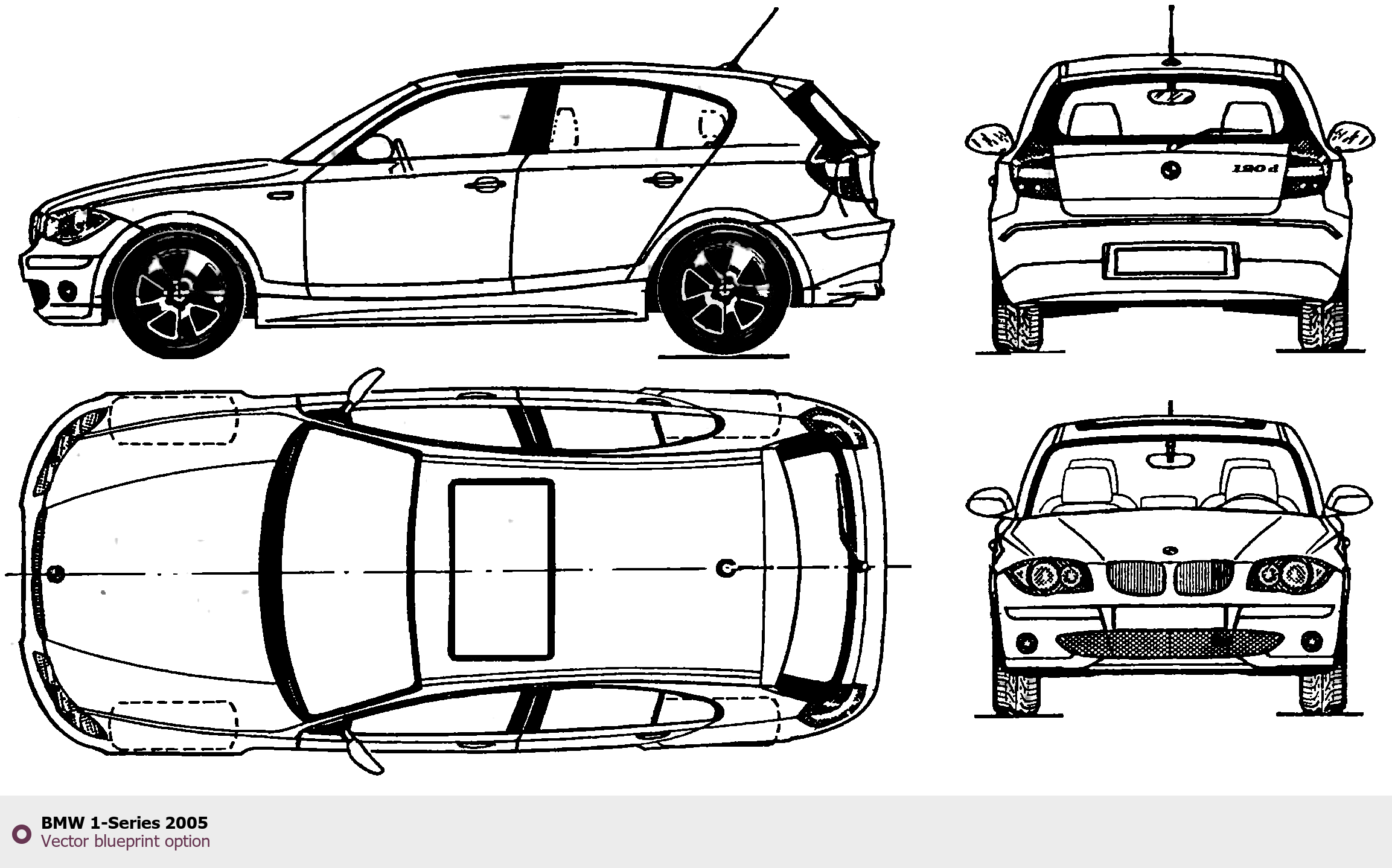 Raster blueprint of the 2005 BMW 1-Series Tag. This free downloadable image can be used for graphic projects, digital design, and 3D modeling. The file provides accurate exterior proportions of the vehicle. Model year: 2005. Body type: Tag.