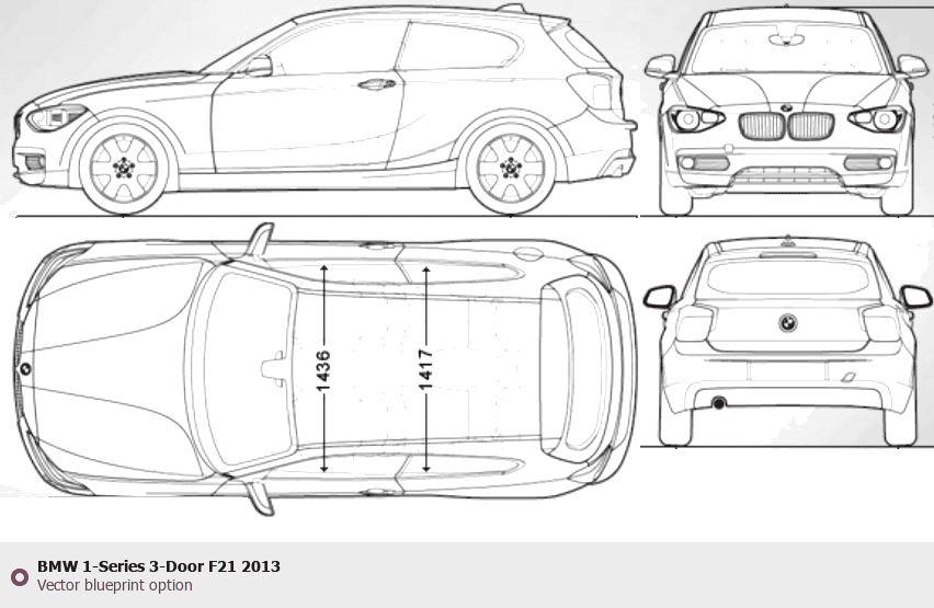 Raster blueprint of the 2013 BMW 1-Series 3-Door F21 Tag. This free downloadable image can be used for graphic projects, digital design, and 3D modeling. The file provides accurate exterior proportions of the vehicle. Model year: 2013. Body type: Tag.