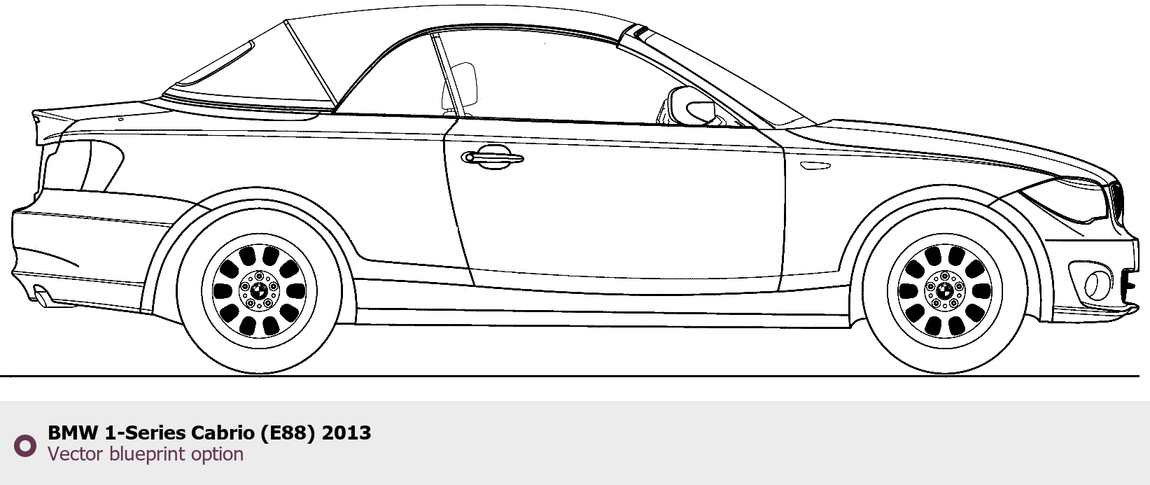 Raster blueprint of the 2013 BMW 1-Series Cabrio (E88) Cabriolet. This free downloadable image can be used for graphic projects, digital design, and 3D modeling. The file provides accurate exterior proportions of the vehicle. Model year: 2013. Body type: Cabriolet.