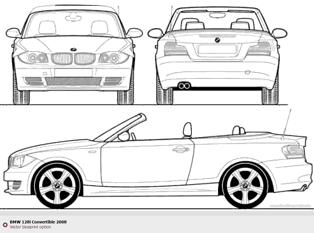 Raster blueprint of the 2008 BMW 128i Convertible Cabriolet. This free downloadable image can be used for graphic projects, digital design, and 3D modeling. The file provides accurate exterior proportions of the vehicle. Model year: 2008. Body type: Cabriolet.