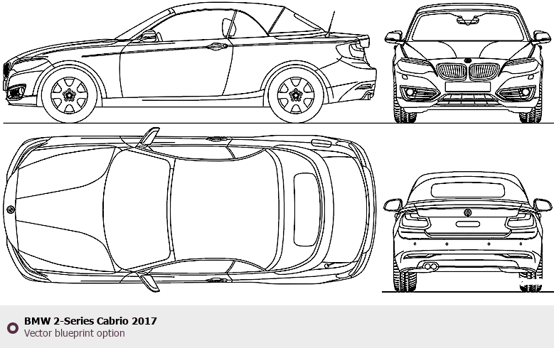 Raster blueprint of the 2017 BMW 2-Series Cabrio Cabriolet. This free downloadable image can be used for graphic projects, digital design, and 3D modeling. The file provides accurate exterior proportions of the vehicle. Model year: 2017. Body type: Cabriolet.
