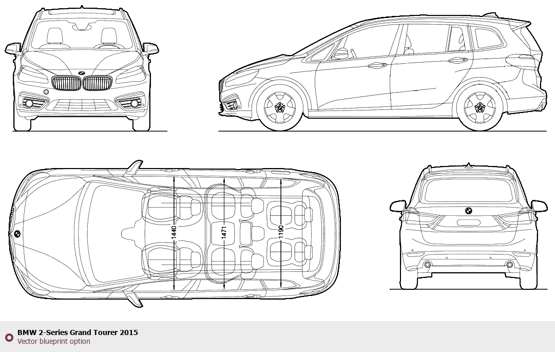 Raster blueprint of the 2015 BMW 2-Series Grand Tourer Tag. This free downloadable image can be used for graphic projects, digital design, and 3D modeling. The file provides accurate exterior proportions of the vehicle. Model year: 2015. Body type: Tag.