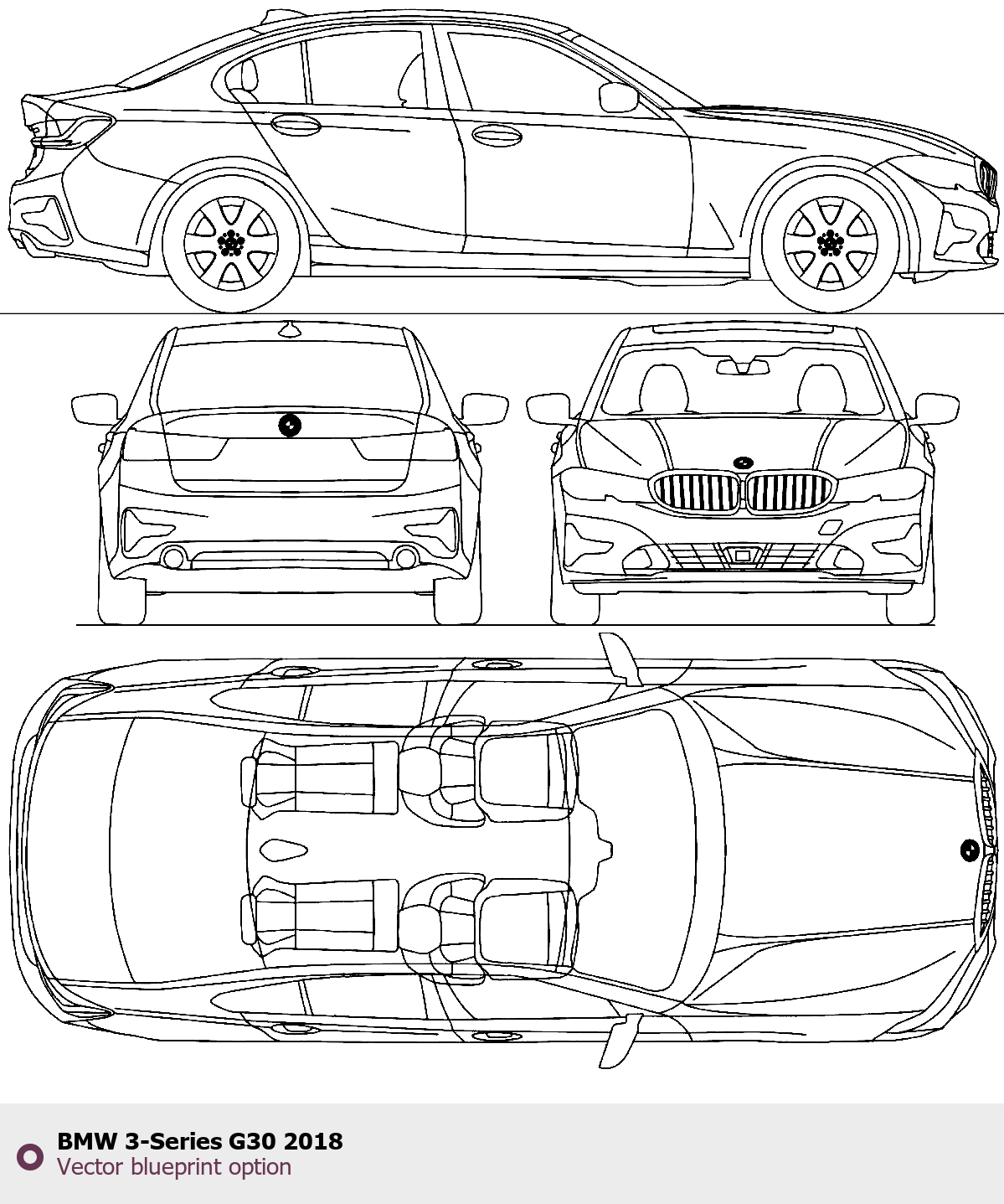 Raster blueprint of the 2018 BMW 3-Series G30 Tag. This free downloadable image can be used for graphic projects, digital design, and 3D modeling. The file provides accurate exterior proportions of the vehicle. Model year: 2018. Body type: Tag.