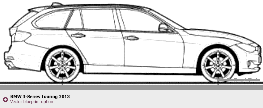 Raster blueprint of the 2013 BMW 3-Series Touring Wagon. This free downloadable image can be used for graphic projects, digital design, and 3D modeling. The file provides accurate exterior proportions of the vehicle. Model year: 2013. Body type: Wagon.