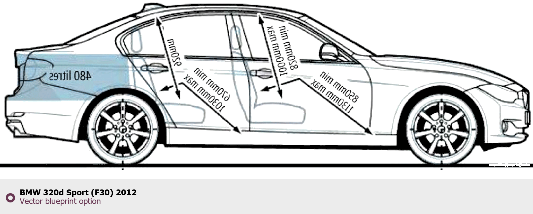 Raster blueprint of the 2012 BMW 320d Sport (F30) Tag. This free downloadable image can be used for graphic projects, digital design, and 3D modeling. The file provides accurate exterior proportions of the vehicle. Model year: 2012. Body type: Tag.