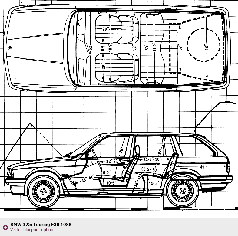 Raster blueprint of the 1988 BMW 325i Touring E30 Wagon. This free downloadable image can be used for graphic projects, digital design, and 3D modeling. The file provides accurate exterior proportions of the vehicle. Model year: 1988. Body type: Wagon.