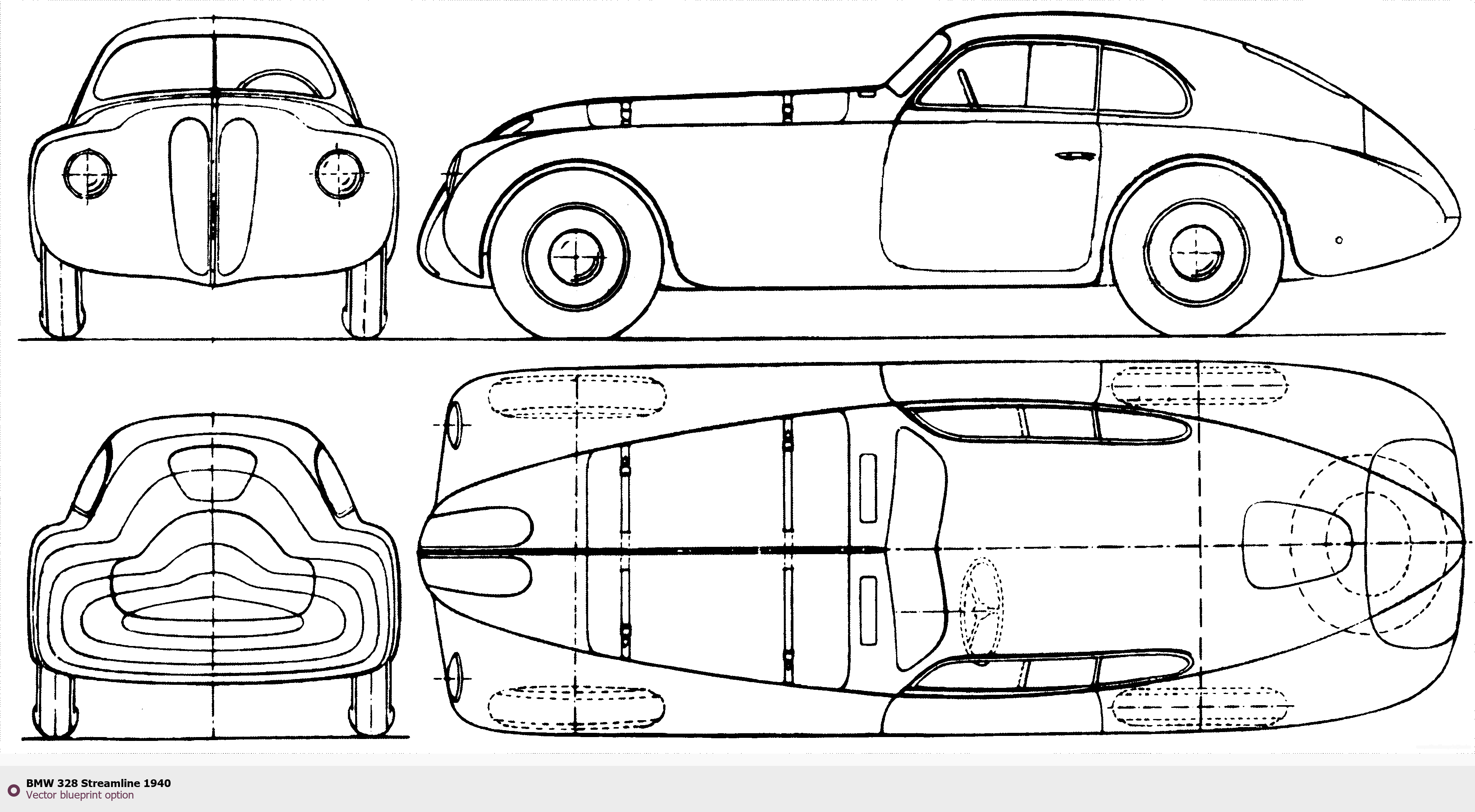 Raster blueprint of the 1940 BMW 328 Streamline Tag. This free downloadable image can be used for graphic projects, digital design, and 3D modeling. The file provides accurate exterior proportions of the vehicle. Model year: 1940. Body type: Tag.