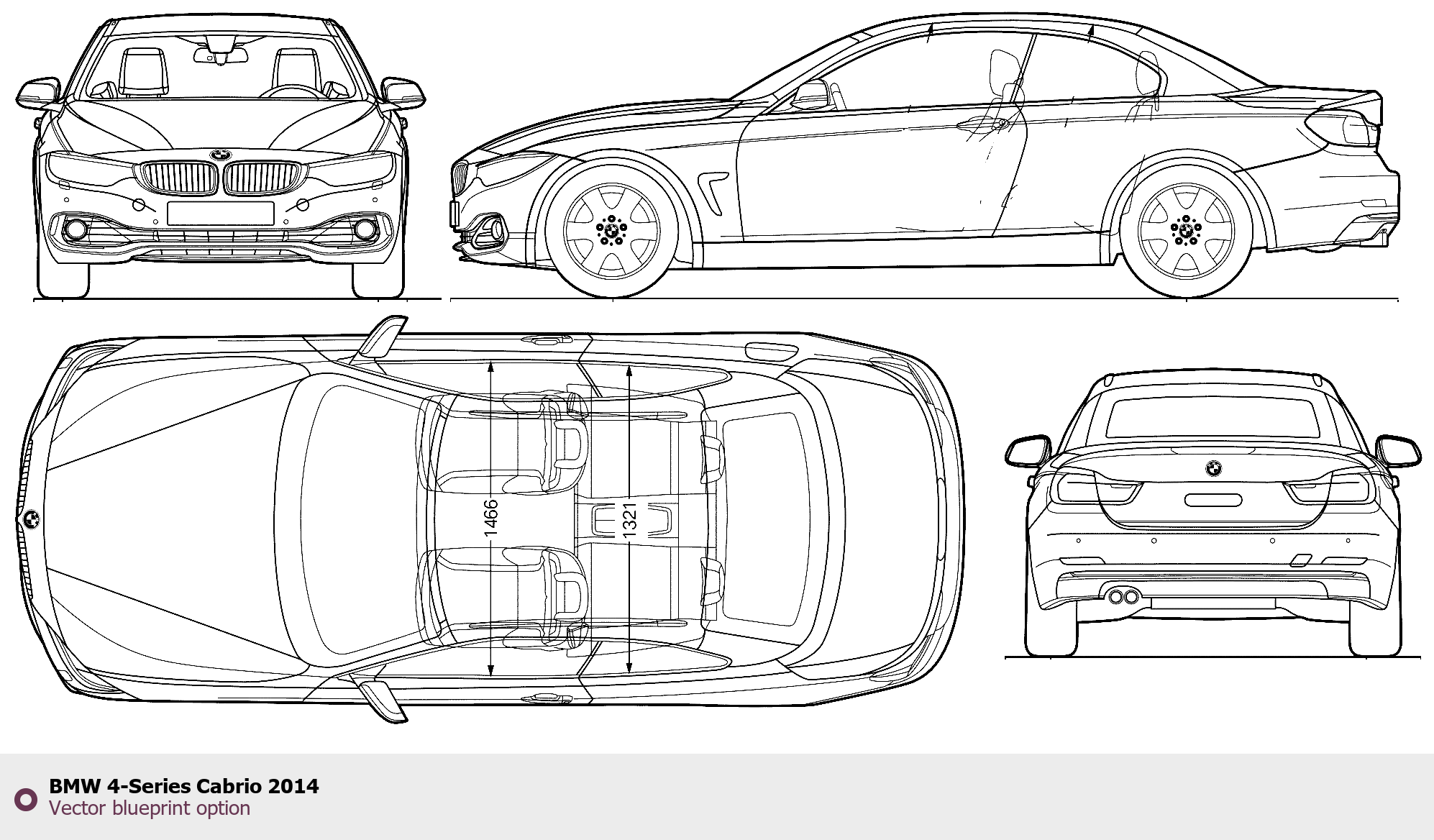 Raster blueprint of the 2014 BMW 4-Series Cabrio Cabriolet. This free downloadable image can be used for graphic projects, digital design, and 3D modeling. The file provides accurate exterior proportions of the vehicle. Model year: 2014. Body type: Cabriolet.