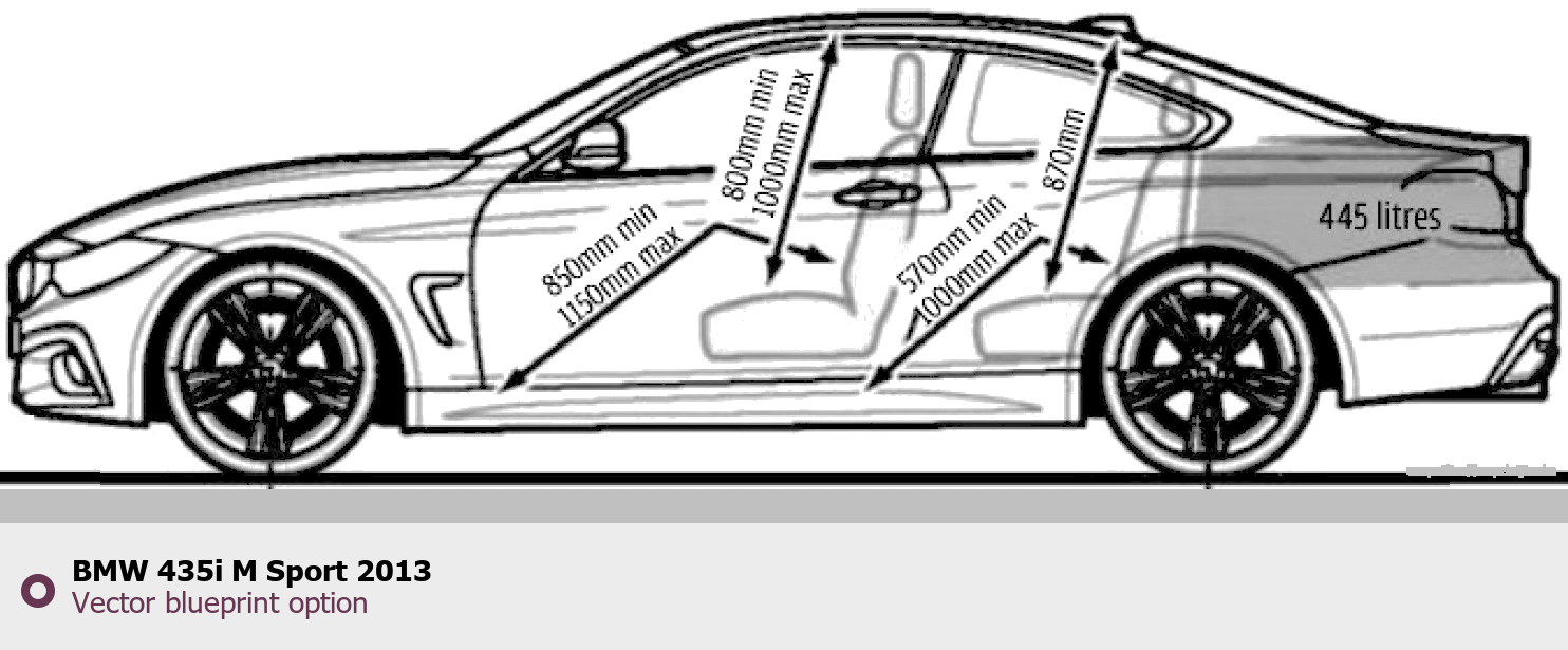 Raster blueprint of the 2013 BMW 435i M Sport Tag. This free downloadable image can be used for graphic projects, digital design, and 3D modeling. The file provides accurate exterior proportions of the vehicle. Model year: 2013. Body type: Tag.