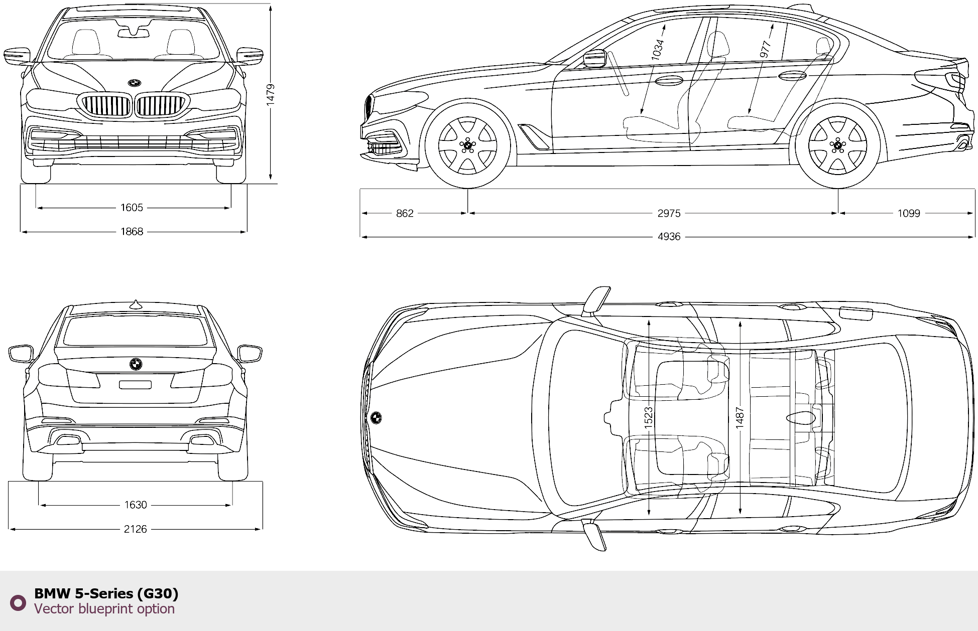Raster blueprint of the BMW 5-Series (G30) Tag. This free downloadable image can be used for graphic projects, digital design, and 3D modeling. The file provides accurate exterior proportions of the vehicle. Body type: Tag.