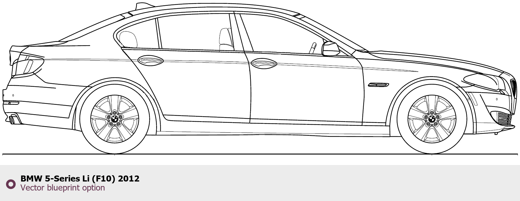 Raster blueprint of the 2012 BMW 5-Series Li (F10) Tag. This free downloadable image can be used for graphic projects, digital design, and 3D modeling. The file provides accurate exterior proportions of the vehicle. Model year: 2012. Body type: Tag.