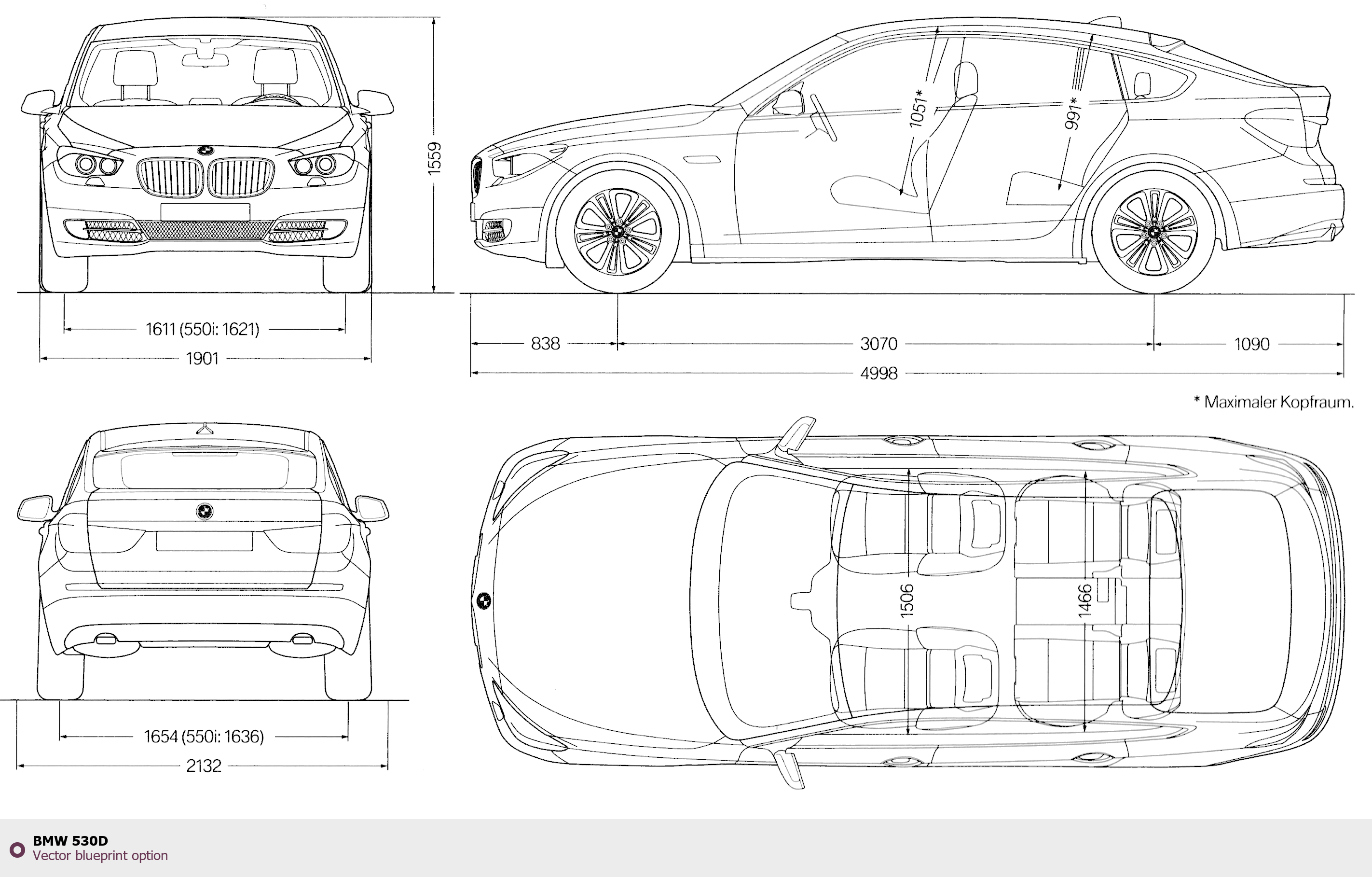 Raster blueprint of the BMW 530D Tag. This free downloadable image can be used for graphic projects, digital design, and 3D modeling. The file provides accurate exterior proportions of the vehicle. Body type: Tag.