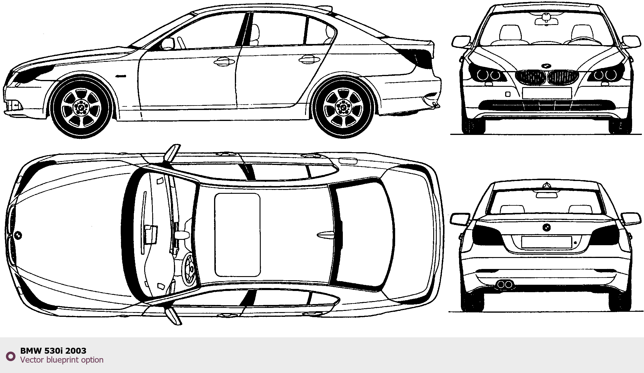 Raster blueprint of the 2003 BMW 530i Tag. This free downloadable image can be used for graphic projects, digital design, and 3D modeling. The file provides accurate exterior proportions of the vehicle. Model year: 2003. Body type: Tag.