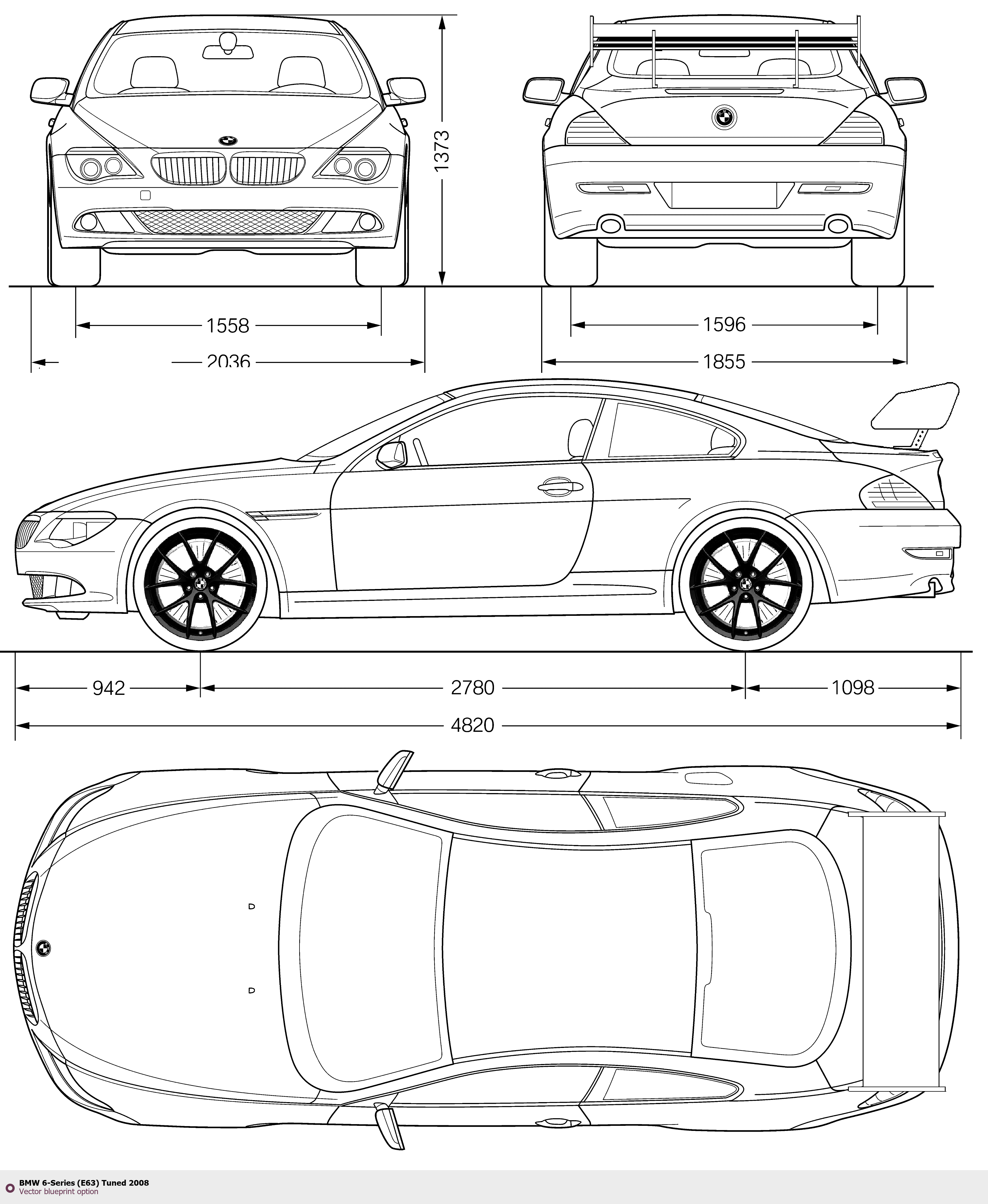 Raster blueprint of the 2008 BMW 6-Series (E63) Tuned Coupe. This free downloadable image can be used for graphic projects, digital design, and 3D modeling. The file provides accurate exterior proportions of the vehicle. Model year: 2008. Body type: Coupe.