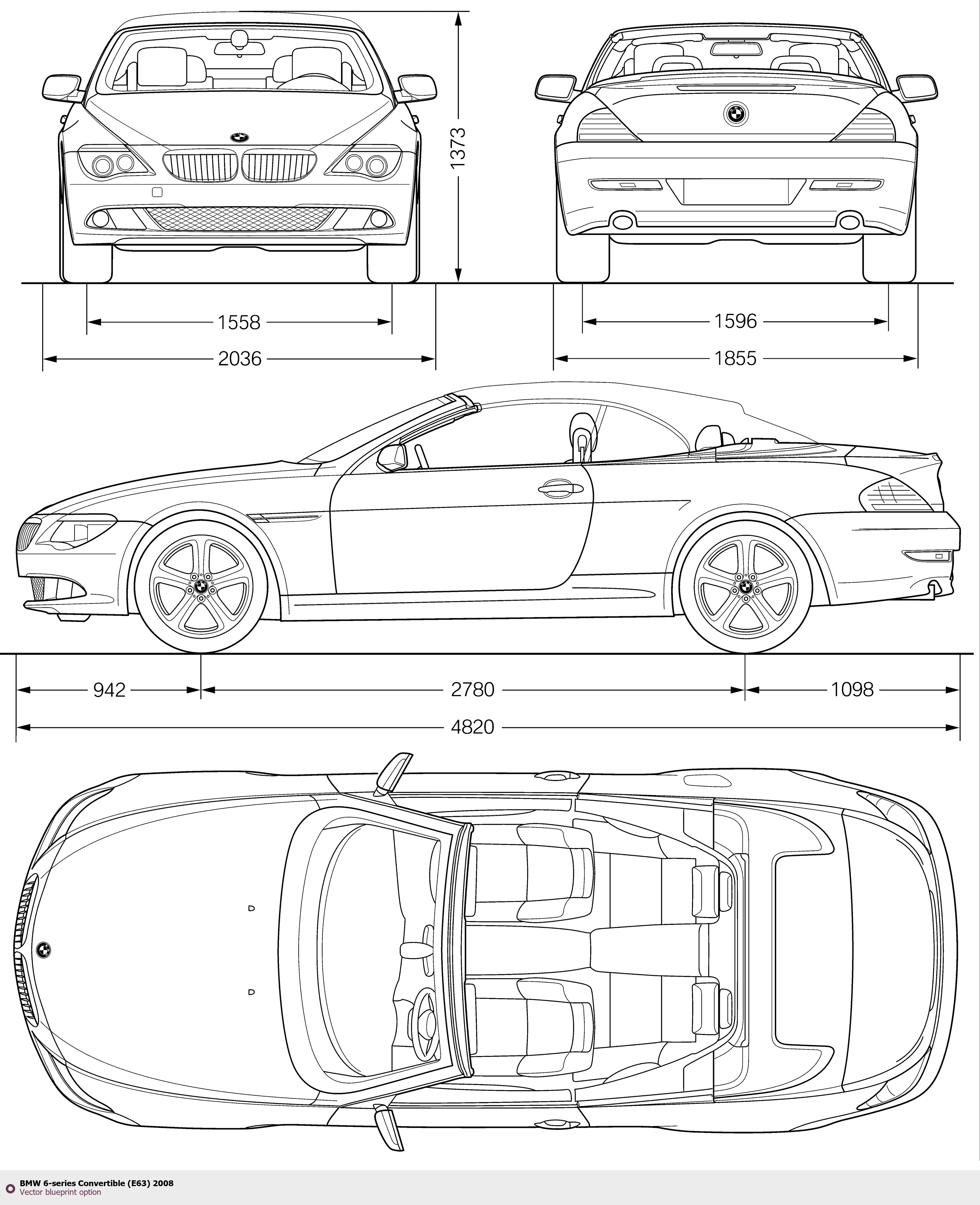 Raster blueprint of the 2008 BMW 6-series Convertible (E63) Cabriolet. This free downloadable image can be used for graphic projects, digital design, and 3D modeling. The file provides accurate exterior proportions of the vehicle. Model year: 2008. Body type: Cabriolet.