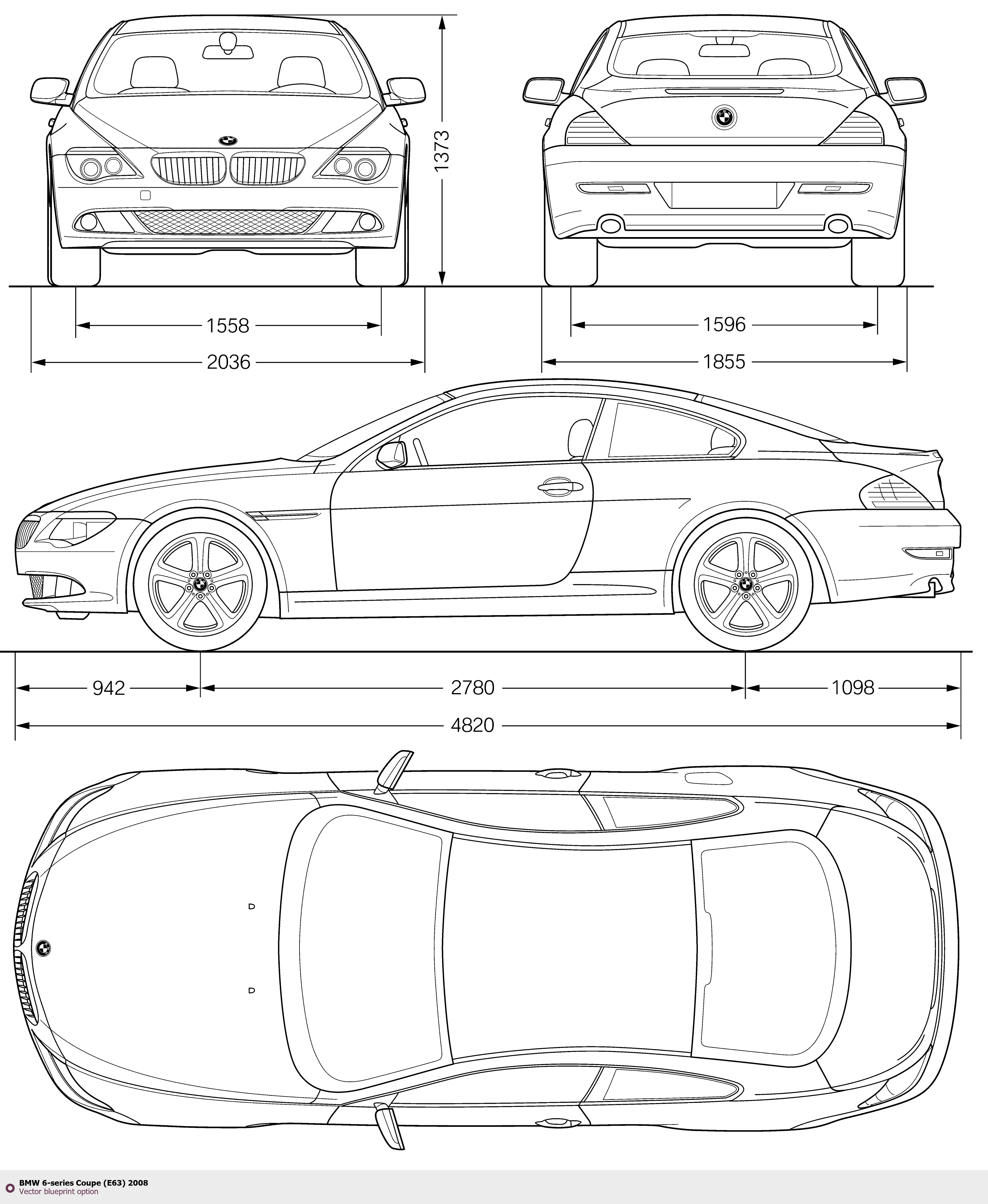 Raster blueprint of the 2008 BMW 6-series Coupe (E63) Coupe. This free downloadable image can be used for graphic projects, digital design, and 3D modeling. The file provides accurate exterior proportions of the vehicle. Model year: 2008. Body type: Coupe.