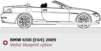 Raster blueprint of the 2009 BMW 650i (E64) Tag. This free downloadable image can be used for graphic projects, digital design, and 3D modeling. The file provides accurate exterior proportions of the vehicle. Model year: 2009. Body type: Tag.