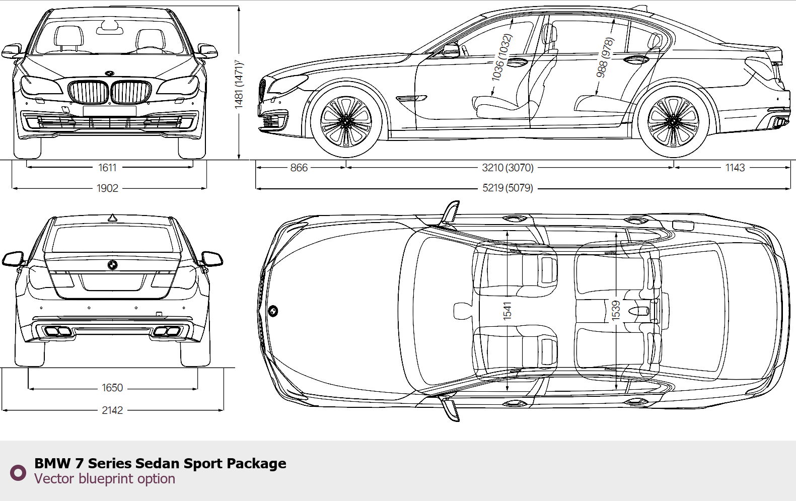 Raster blueprint of the BMW 7 Series Sedan Sport Package Sedan. This free downloadable image can be used for graphic projects, digital design, and 3D modeling. The file provides accurate exterior proportions of the vehicle. Body type: Sedan.