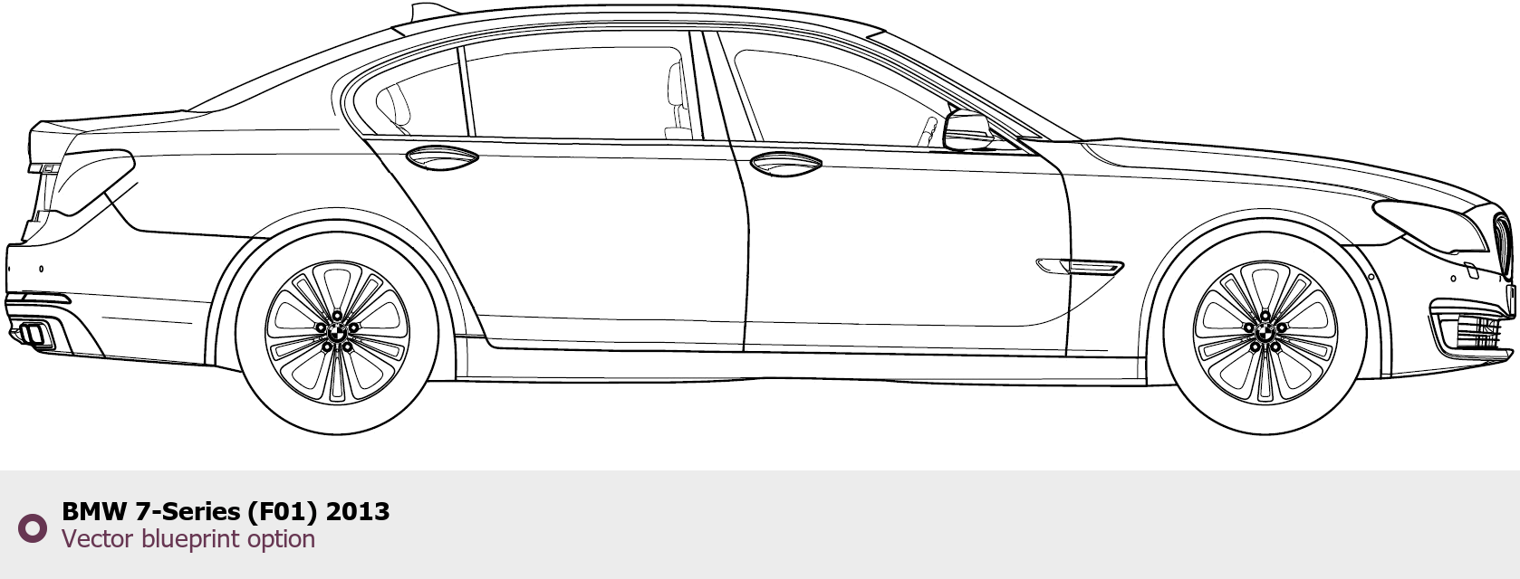 Raster blueprint of the 2013 BMW 7-Series (F01) Sedan. This free downloadable image can be used for graphic projects, digital design, and 3D modeling. The file provides accurate exterior proportions of the vehicle. Model year: 2013. Body type: Sedan.