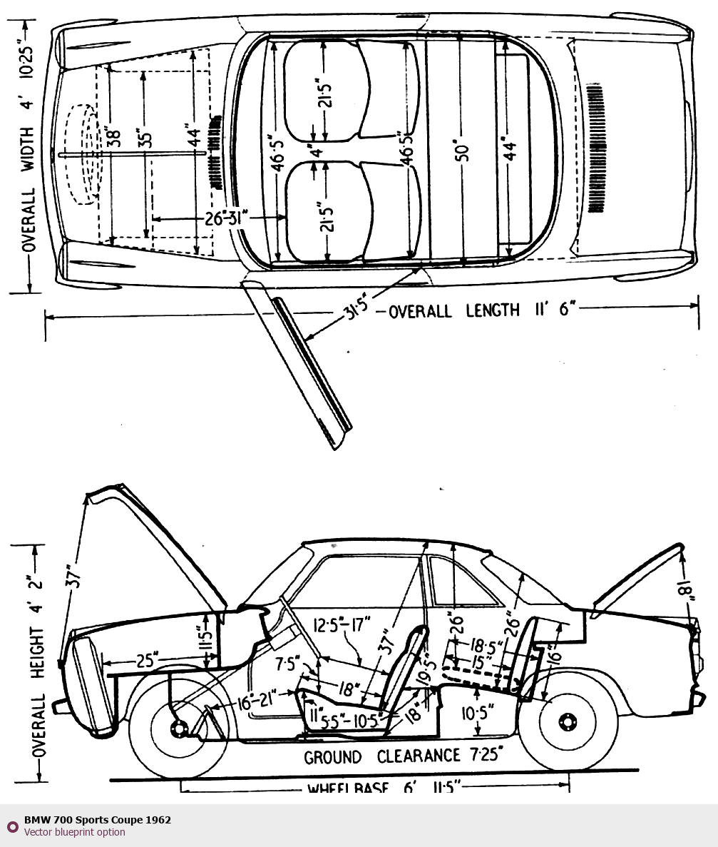 Raster blueprint of the 1962 BMW 700 Sports Coupe Coupe. This free downloadable image can be used for graphic projects, digital design, and 3D modeling. The file provides accurate exterior proportions of the vehicle. Model year: 1962. Body type: Coupe.