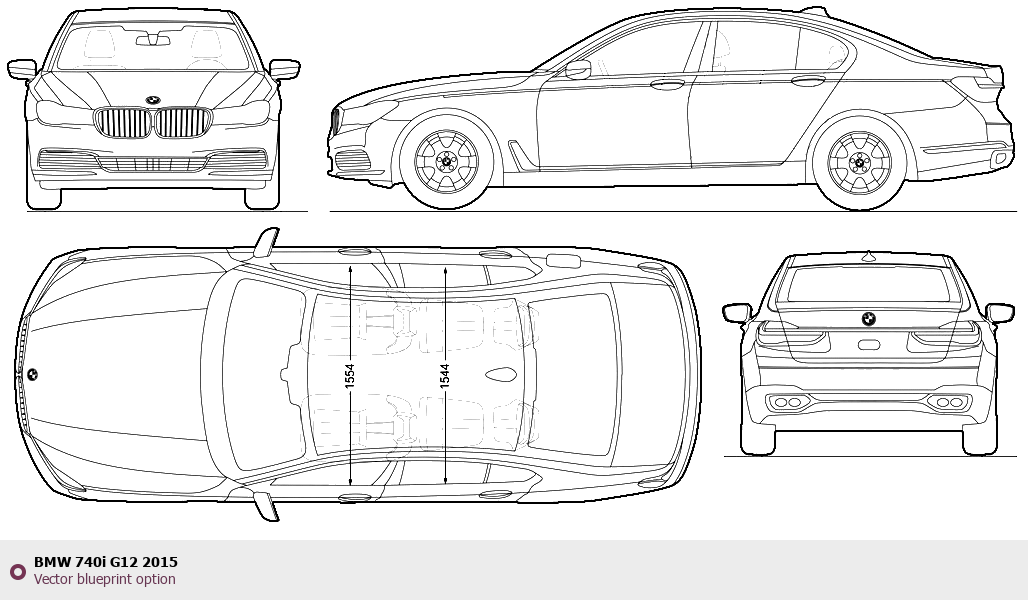 Raster blueprint of the 2015 BMW 740i G12 Tag. This free downloadable image can be used for graphic projects, digital design, and 3D modeling. The file provides accurate exterior proportions of the vehicle. Model year: 2015. Body type: Tag.