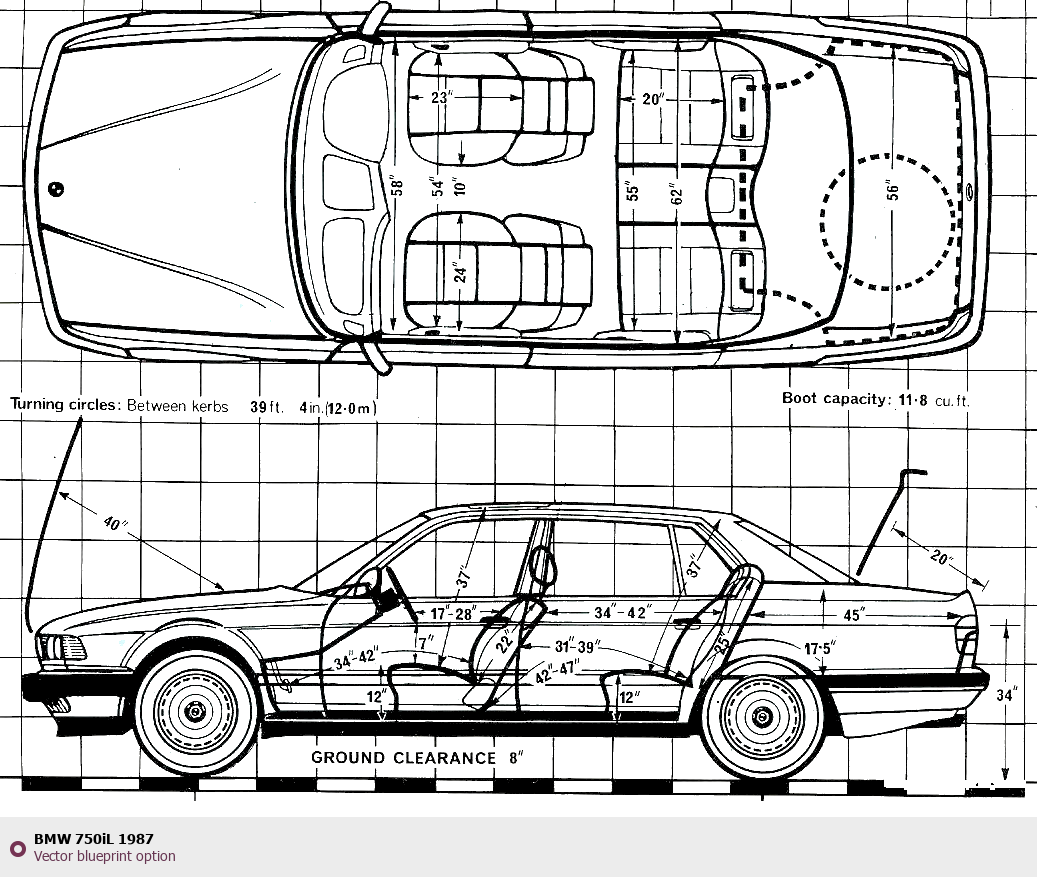 Raster blueprint of the 1987 BMW 750iL Tag. This free downloadable image can be used for graphic projects, digital design, and 3D modeling. The file provides accurate exterior proportions of the vehicle. Model year: 1987. Body type: Tag.