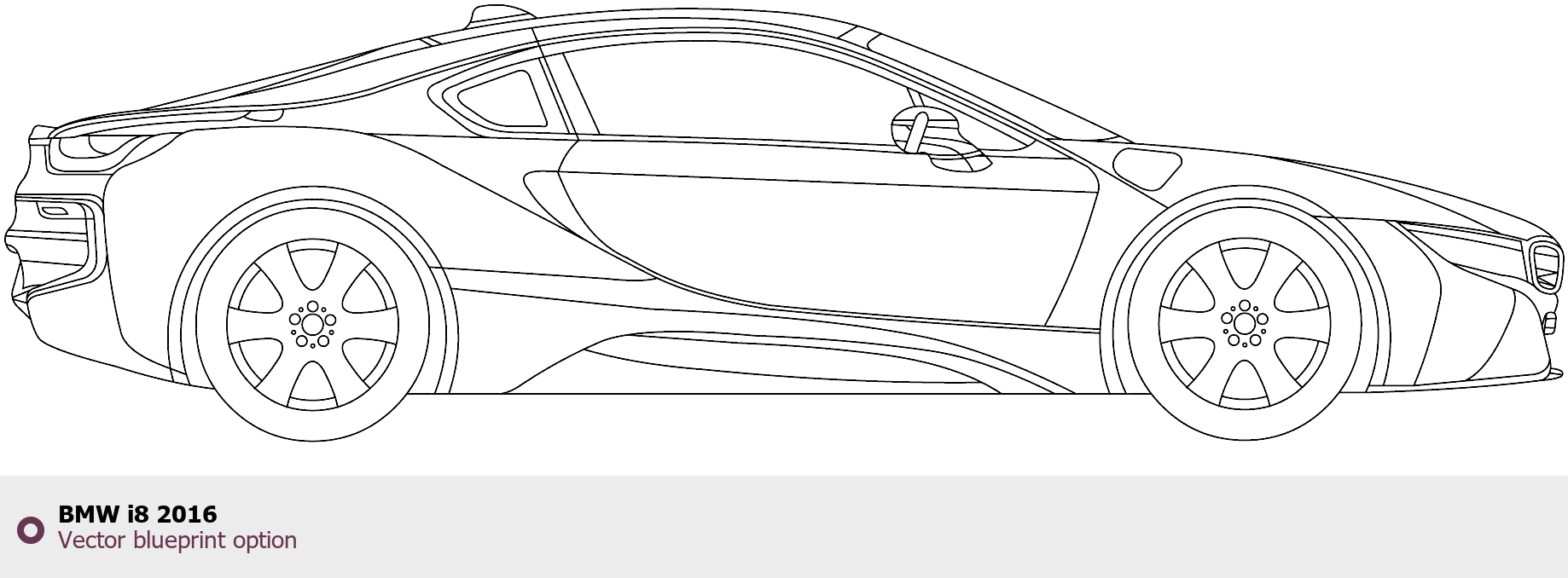 Raster blueprint of the 2016 BMW i8 Coupe. This free downloadable image can be used for graphic projects, digital design, and 3D modeling. The file provides accurate exterior proportions of the vehicle. Model year: 2016. Body type: Coupe.