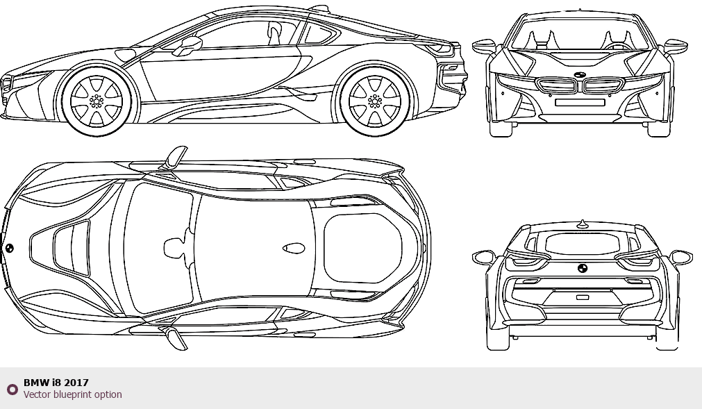 Raster blueprint of the 2017 BMW i8 Coupe. This free downloadable image can be used for graphic projects, digital design, and 3D modeling. The file provides accurate exterior proportions of the vehicle. Model year: 2017. Body type: Coupe.