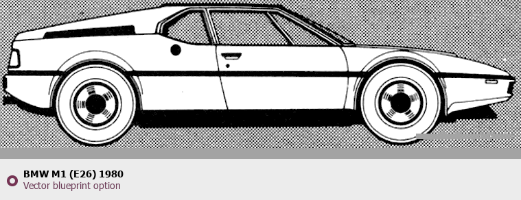 Raster blueprint of the 1980 BMW M1 (E26) Tag. This free downloadable image can be used for graphic projects, digital design, and 3D modeling. The file provides accurate exterior proportions of the vehicle. Model year: 1980. Body type: Tag.