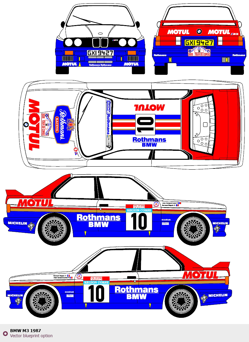 Raster blueprint of the 1987 BMW M3 Tag. This free downloadable image can be used for graphic projects, digital design, and 3D modeling. The file provides accurate exterior proportions of the vehicle. Model year: 1987. Body type: Tag.