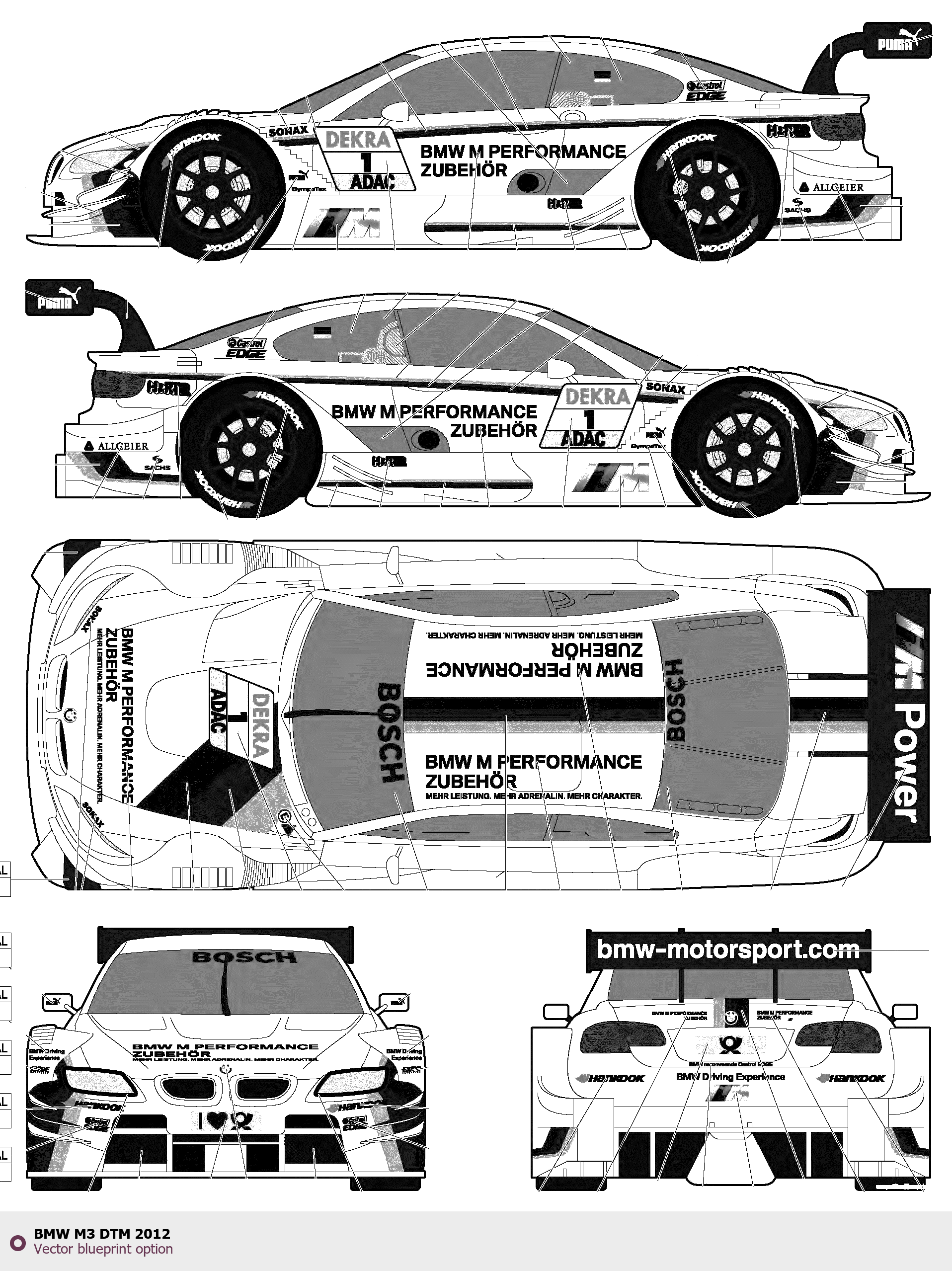 Raster blueprint of the 2012 BMW M3 DTM Tag. This free downloadable image can be used for graphic projects, digital design, and 3D modeling. The file provides accurate exterior proportions of the vehicle. Model year: 2012. Body type: Tag.