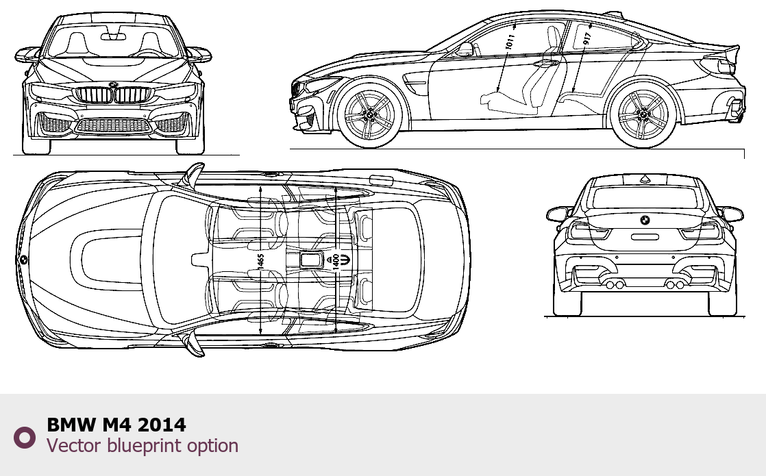 Raster blueprint of the 2014 BMW M4 Tag. This free downloadable image can be used for graphic projects, digital design, and 3D modeling. The file provides accurate exterior proportions of the vehicle. Model year: 2014. Body type: Tag.