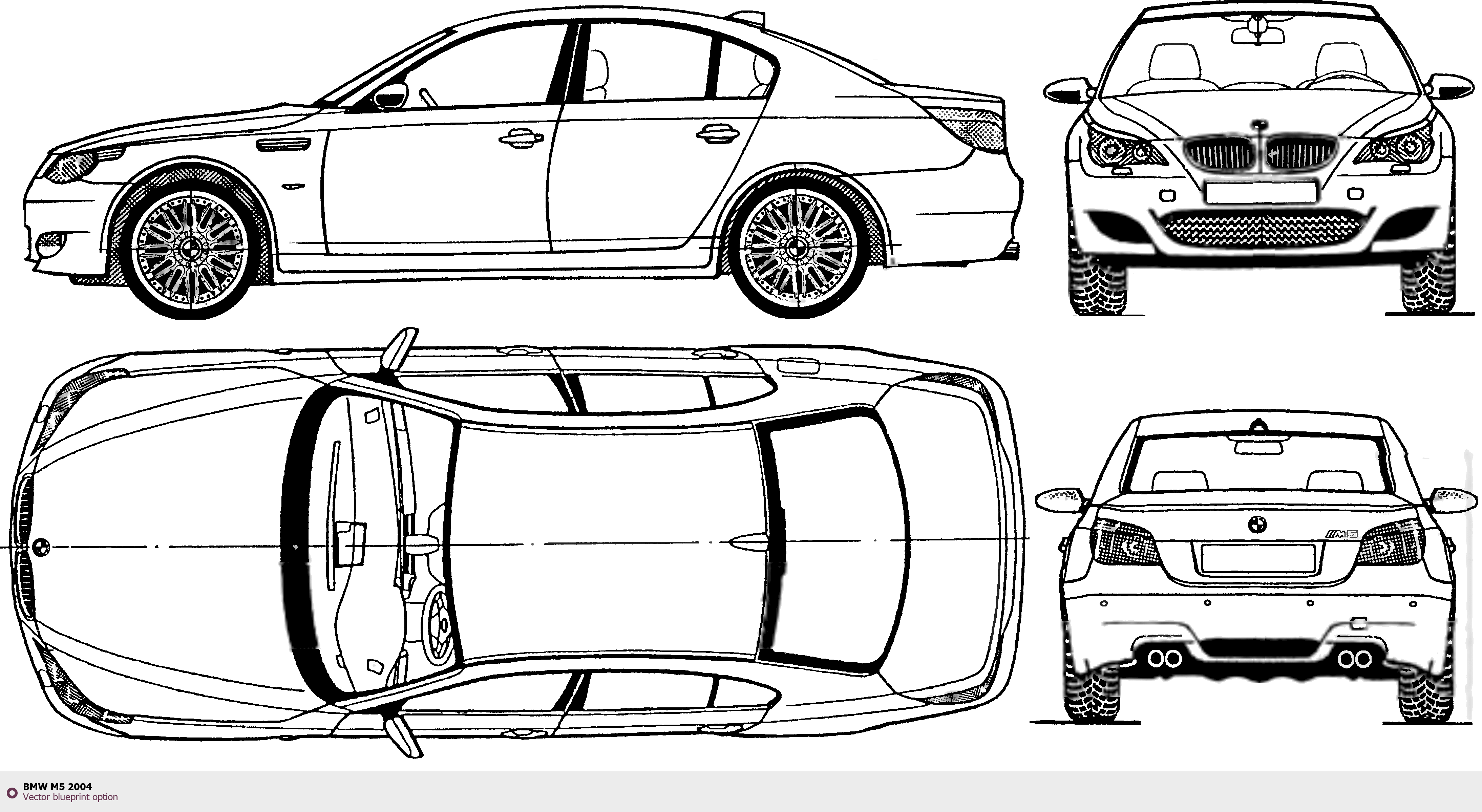 Raster blueprint of the 2004 BMW M5 Tag. This free downloadable image can be used for graphic projects, digital design, and 3D modeling. The file provides accurate exterior proportions of the vehicle. Model year: 2004. Body type: Tag.