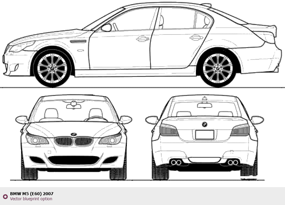 Raster blueprint of the 2007 BMW M5 (E60) Tag. This free downloadable image can be used for graphic projects, digital design, and 3D modeling. The file provides accurate exterior proportions of the vehicle. Model year: 2007. Body type: Tag.