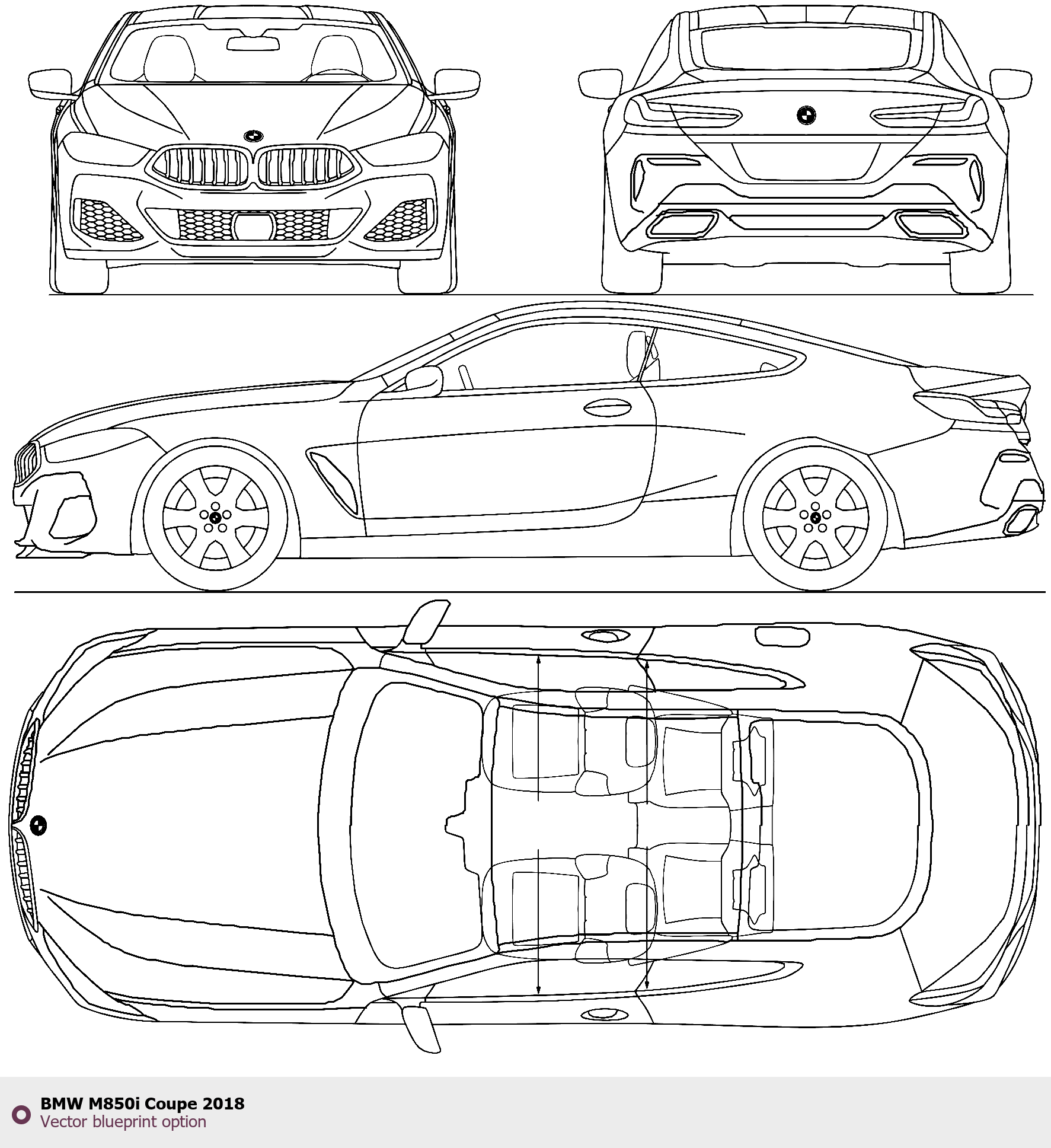 Raster blueprint of the 2018 BMW M850i Coupe Coupe. This free downloadable image can be used for graphic projects, digital design, and 3D modeling. The file provides accurate exterior proportions of the vehicle. Model year: 2018. Body type: Coupe.