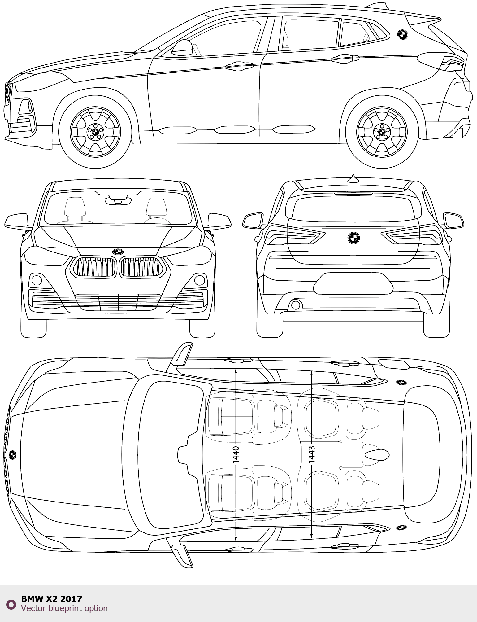 Raster blueprint of the 2017 BMW X2 Tag. This free downloadable image can be used for graphic projects, digital design, and 3D modeling. The file provides accurate exterior proportions of the vehicle. Model year: 2017. Body type: Tag.