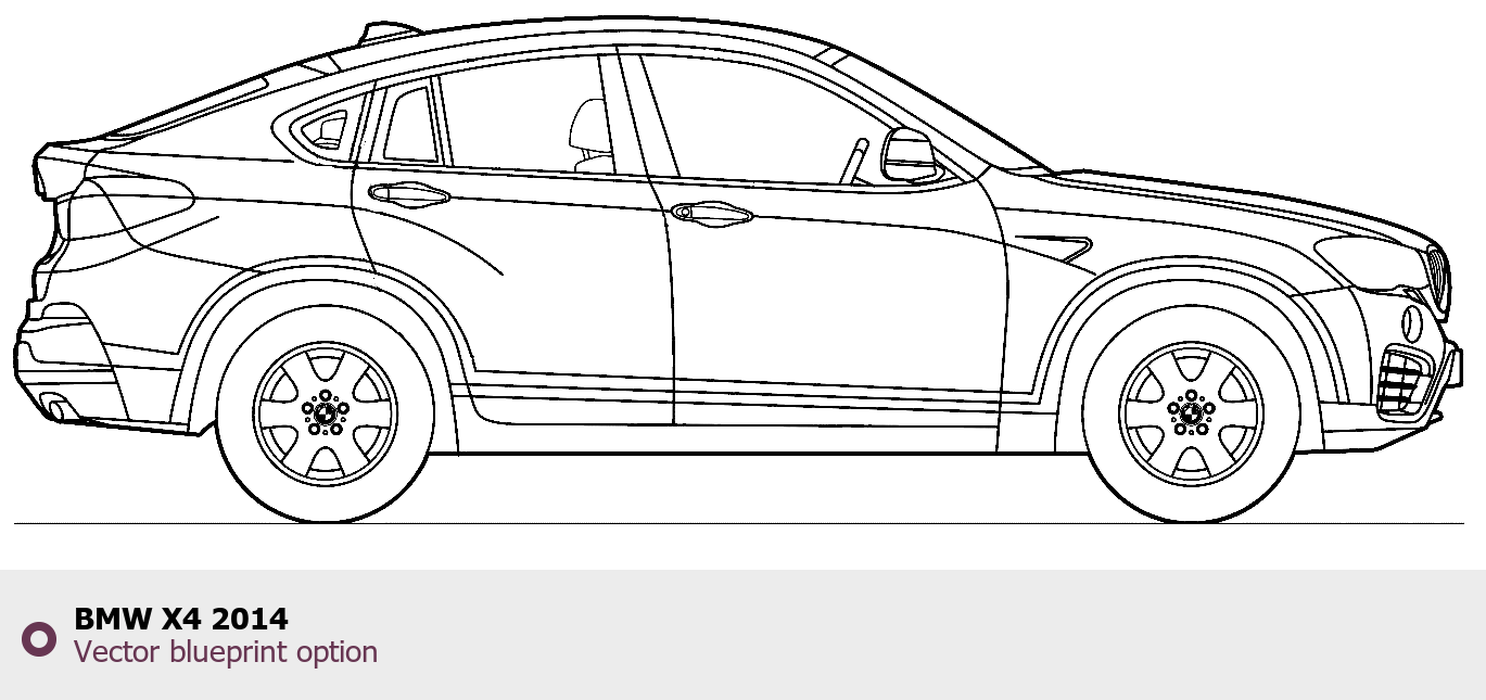 Raster blueprint of the 2014 BMW X4 SUV. This free downloadable image can be used for graphic projects, digital design, and 3D modeling. The file provides accurate exterior proportions of the vehicle. Model year: 2014. Body type: SUV.