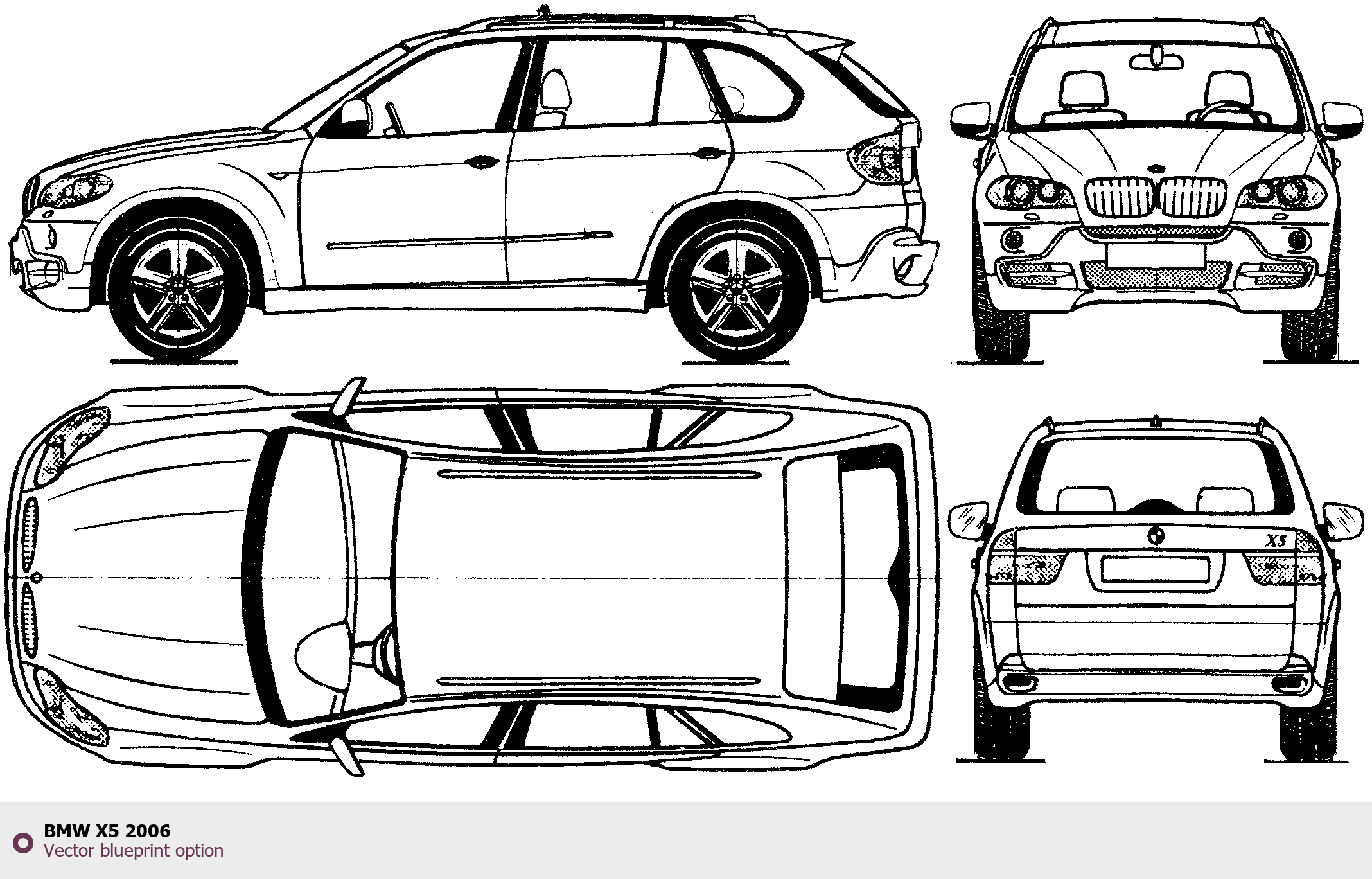 Raster blueprint of the 2006 BMW X5 SUV. This free downloadable image can be used for graphic projects, digital design, and 3D modeling. The file provides accurate exterior proportions of the vehicle. Model year: 2006. Body type: SUV.