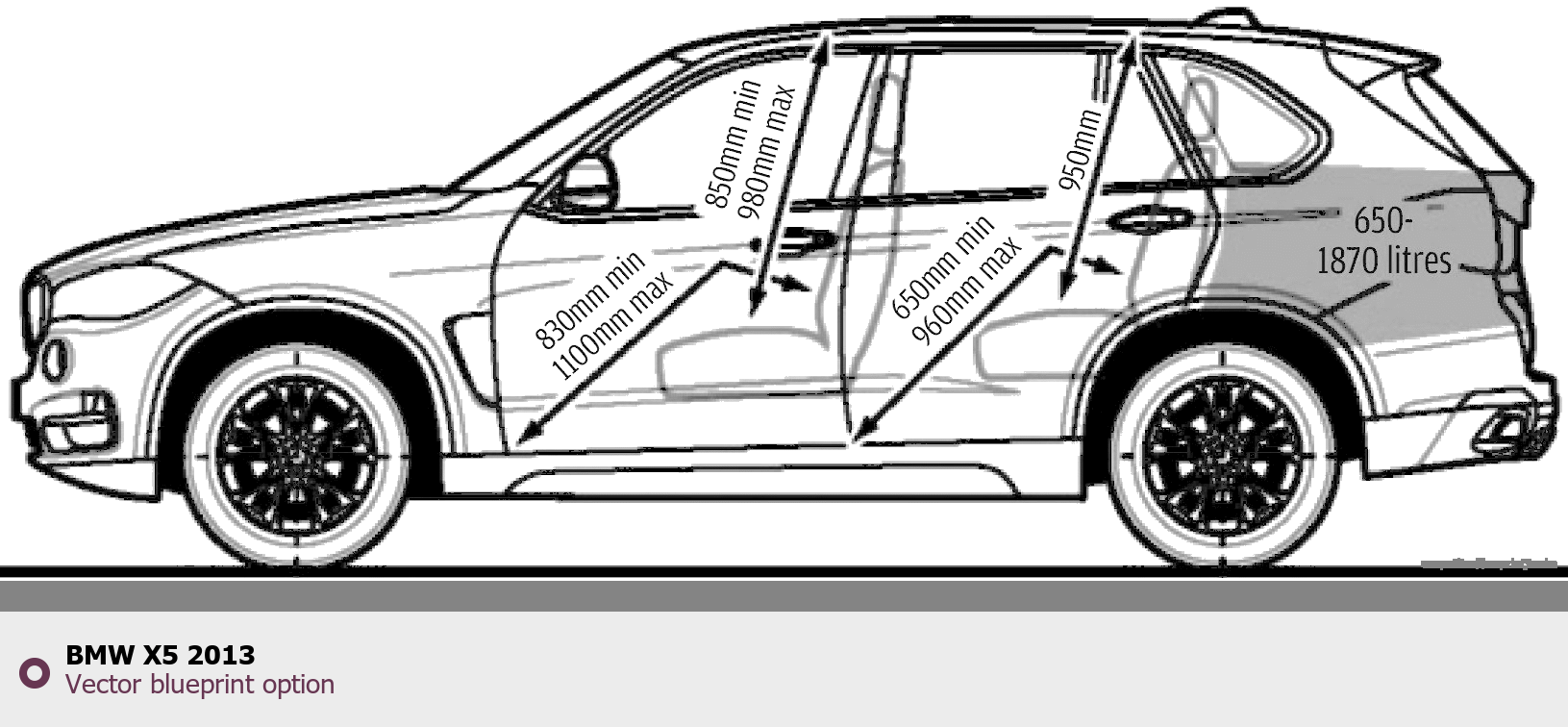 Raster blueprint of the 2013 BMW X5 SUV. This free downloadable image can be used for graphic projects, digital design, and 3D modeling. The file provides accurate exterior proportions of the vehicle. Model year: 2013. Body type: SUV.