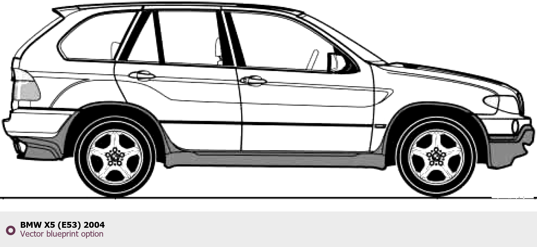 Raster blueprint of the 2004 BMW X5 (E53) SUV. This free downloadable image can be used for graphic projects, digital design, and 3D modeling. The file provides accurate exterior proportions of the vehicle. Model year: 2004. Body type: SUV.
