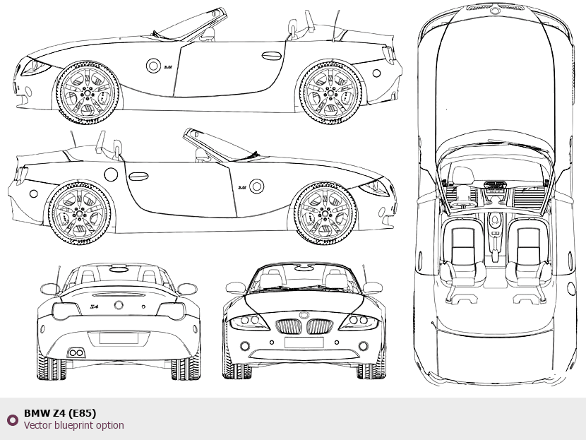 Raster blueprint of the BMW Z4 (E85) Tag. This free downloadable image can be used for graphic projects, digital design, and 3D modeling. The file provides accurate exterior proportions of the vehicle. Body type: Tag.