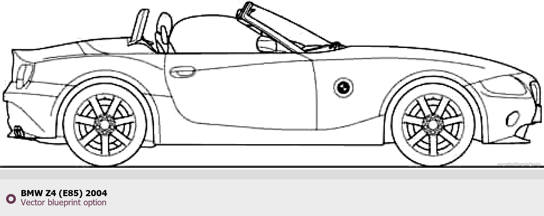 Raster blueprint of the 2004 BMW Z4 (E85) Tag. This free downloadable image can be used for graphic projects, digital design, and 3D modeling. The file provides accurate exterior proportions of the vehicle. Model year: 2004. Body type: Tag.