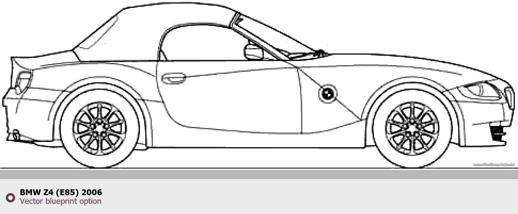Raster blueprint of the 2006 BMW Z4 (E85) Tag. This free downloadable image can be used for graphic projects, digital design, and 3D modeling. The file provides accurate exterior proportions of the vehicle. Model year: 2006. Body type: Tag.